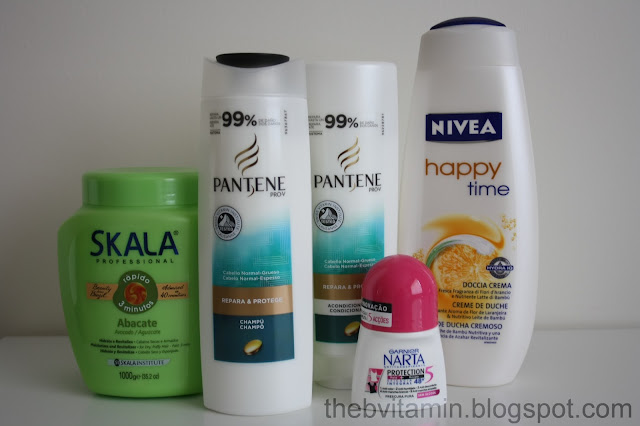 The products are: hair mask, 3 minutes, avocado from Skala Professional; shampoo and conditioner “Repair and Protect” (thick and normal hair) from Pantene; shower cream from Nívea Happy Time and deodorante “Protection 5” from Garnier Narta.